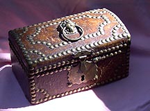 Many people take safe deposit boxes for granted today. But in the 18th and early 19th centuries, they didn’t exist, so people had to store their valuable documents–bills of sale, certificates, etc.--in small, locked wooden boxes which ranged in size from 5 to 12 inches long and from 4 to 5 inches wide. Most were made of pine covered in leather, such as this one, or painted or stained. This American-made domed box, from the author’s collection, has a stamped brown leather exterior with tiny flower design, attached with brass nails. It’s top is attached with leather hinges. It’s interior is covered with paper decorated in a blue diamond pattern. Due to a some minor leather repair on the rear of the box and a replaced handle, the value of the box is between $500 and $600.