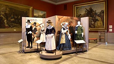 Pilgrims dressed in black, gray, and white, cranberry sauce, and