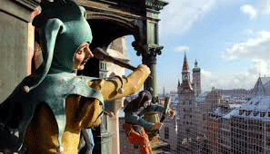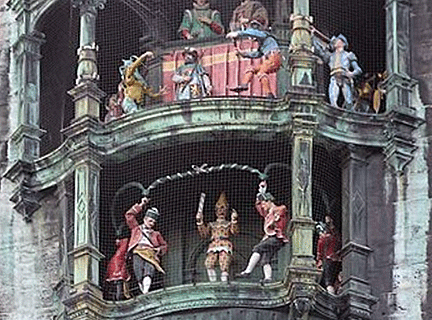 11 A.M. daily, crowds of onlookers pack the Marienplatz in Munich to