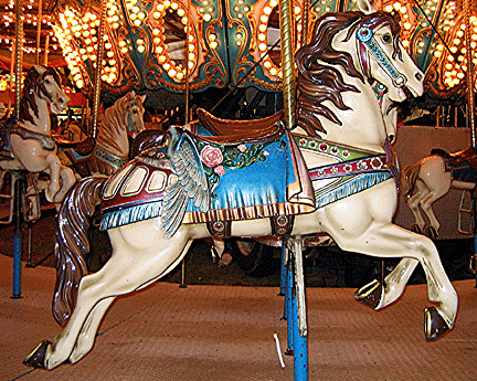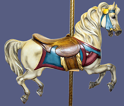 A white carousel horse, frozen in a mid-air gallop, joins