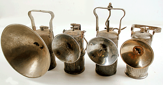 carbide flasks, hats and helmets, instruments for underground surveying,