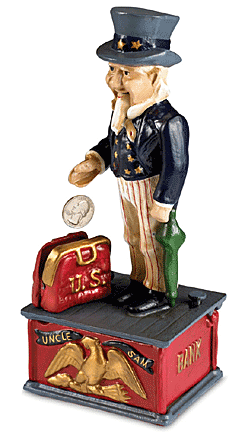 cast-iron banks and doorstops have also been fashioned in Uncle Sam's