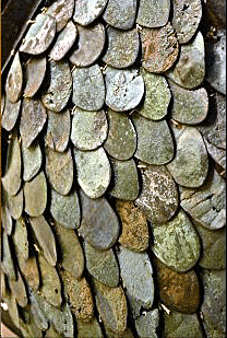 Wired together in horizontal rows, the scales were then laced or sewn to