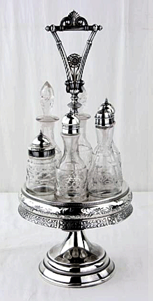 The American Victorian castor set, made of silver plated Britannia metal, is the type most collected today. It held several glass bottles. One pair was for salt and pepper. Usually there was a pair with glass stoppers for oil and vinegar. One bottle had a hinged lid with a slot for a spoon. This was for mustard. Other bottles could hold soy sauce, spices or “castor” sugar which was a pounded sugar—not powdered sugar and