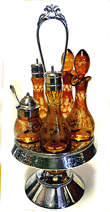 Since the Victorians had a myriad of tableware, each with its own use, there were also pickle and salad castors, their containers being the most interesting feature of these later castors. In addition to pressed glass of blue, canary or crystal, makers used Pomona art glass, opalene twist, imported, decorated ruby glass and cut crystal glass. The glass containers had a fancy plated cover and decorated tongs were fastened to the stand.