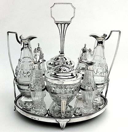 Since manufacturers produced silver castors in large quantities, many of them have survived. However, they’re not always in good condition, and many are missing some or all of their cruet bottles. The cost to replate an antique six-bottle castor frame is about $110 to $130. It could be more cost-effective to find a frame in good condition without the bottles. If a collector needs one or two bottles, he or she may have difficulty finding them to match their set. It’s sometimes easier to find a complete set of six cruet bottles without the frame, especially on the Internet, so the entire set could be replaced.