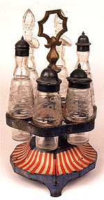 The rotary castor, in which the bottles fitted into holes on a circular platform which stood on a tall cone-type base, was patented in 1862. Makers often decorated its center handle with elaborate openwork design in one of several styles to go along with furniture of the time. Eastlake castors were some of the most popular. In the 1870's, they added heavy grape and beaded borders. Later, the low castor came back into vogue and colored pressed glass containers with Daisy and Button pattern or milk opalescent or cased glass became the rage, thus reducing the silver frame to a few wires.