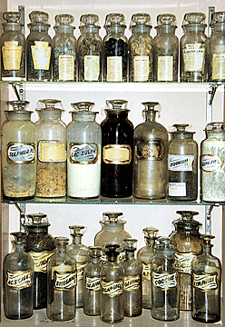 bottles filled with essential oils and crude drugs like arsenic,