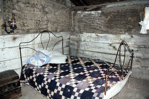 one room cabin. Quilts folded and laid on a board placed between two