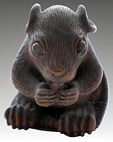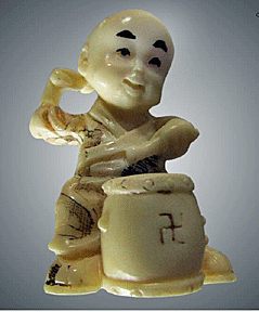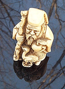And these fakes seem to be flourishing since fine netsuke is beginning to get scarce. Reproductions are showing up in shops and shows. While the ivory may be genuine, the pieces have been "aged" by boiling in strong tea. Other forgers smear their copies with dirt or brown stain to simulate the dust of use.