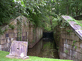 Delaware and Hudson(D&H) Canal lies quiet and still now. Green trees