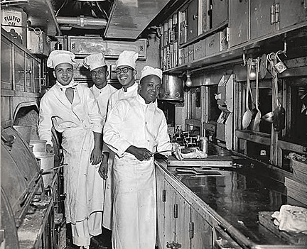 band of chefs working in cramped conditions. Wealthy British passengers
