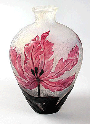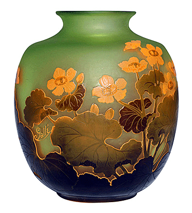 Gallé was the most outstanding artist and technician among the French glassmakers of the late 19th century. He based his early pieces on historical themes, with enameling and gilding on transparent green, white or amber glass. Around 1884, these gave way to realistically drawn flowers and insects, still on transparent glass. During the following years, Galle created some of his most original work in opaque colored glass in a wide variety of techniques. He signed all the pieces. During the 1890s, Galle changed his views about mass production and cut his designs using acid, instead of on the wheel, into the superimposed different colored layers of glass, a technique called “cameo glass.”