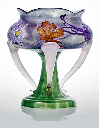 Lalique incorporated glass in his exquisite gold and enameled jewelry Galle naturally had many imitators and Delatte, Arsall, Le Verre Francais, D. Christian & Sohn, Muller Freres and Michel are only a few. Auguste Legras, working in the Paris suburb of St. Denis, also came under his influence, but his work can be distinguished by its pastel shades, often on an attractive creamy base. The glass of the Cristallerie de Pantin has rather flatly drawn flowers enameled and gilt on a frosted ground, or cameo landscapes, and is variously signed `De Vez', `Pantin'or` Mont Joye'.