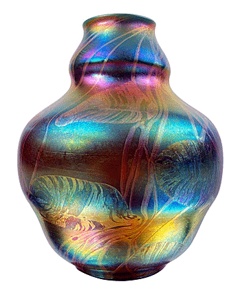 Tiffany experimented constantly. Perhaps his most iconic discovery occurred in 1881 when he created his first pieces of “favrile” glass. Inspired by the delicate iridescence found in specimens of ancient Roman glass, Tiffany set out to replicate the look with outstanding results. Termed “favrile” or “handcrafted”, his technique produced freely shaped forms distinguished by an almost glowing iridescence that possessed an uncanny dichroic trait that separated his creations from those of any other glass artist in the world. From remarkable floriform vases to his most recognizable lamps, his favrile glass art allowed people to enjoy the beauty of nature year round.