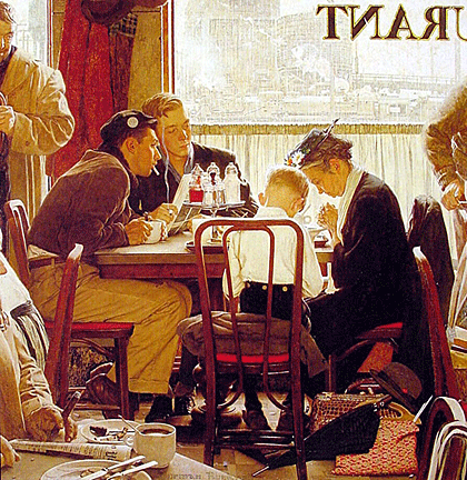every head is bent in fervent prayer. This is Norman Rockwell’s America