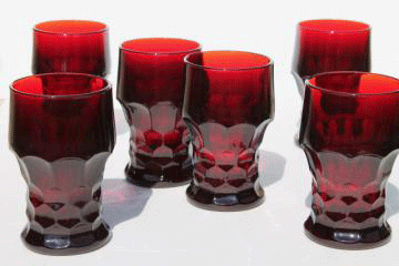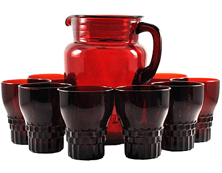 Footed and unfooted sugar and creamer sets, jam jars with crystal bottoms and ruby lids, plus assorted glasses--ribbed, old café, gold rimmed tumblers, and footed wine goblets—were among the myriad of pieces made in the late 1940s and early 1950s. Ice tea sets with large ice-lipped pitchers and six to eight tumblers were especially popular.