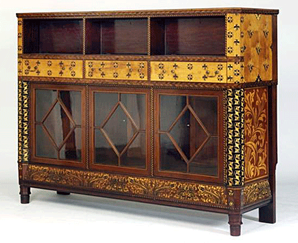 extravagant marquetry, pierced carving, and glazed doors—all very