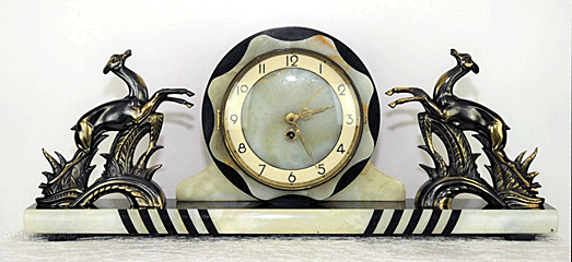 marble, onyx, brass, glass, and chrome in their Deco clocks. Many of