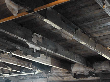 wrapped the joices above his workshop with wallpaper. Workers wet